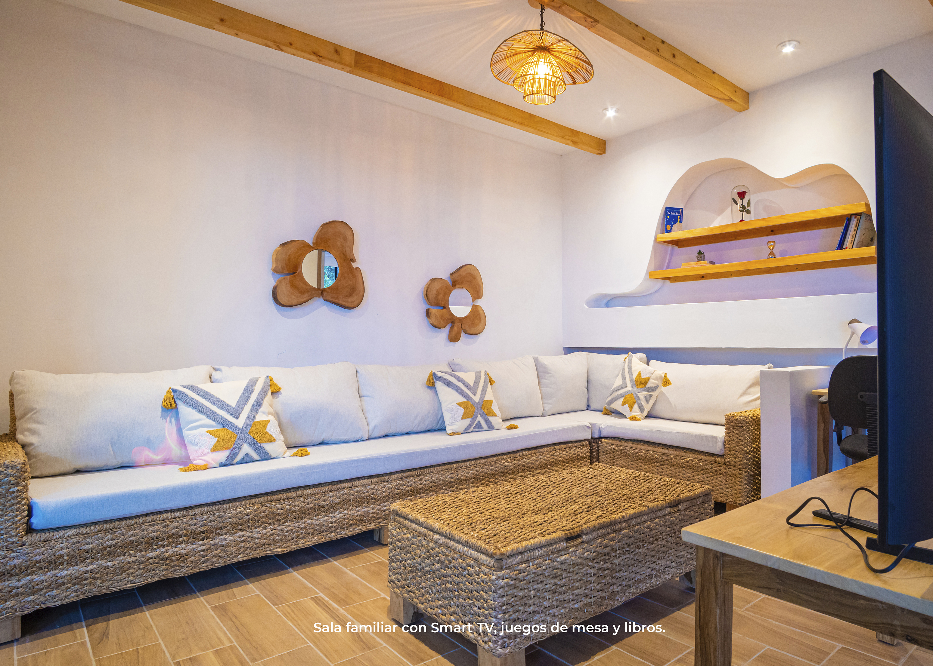 Esta casa es especial pues cuenta con un diseño único. Su techo de teja y detalles en madera crean un espacio cómodo y acogedor. Un espacio perfecto hasta para 7 personas.