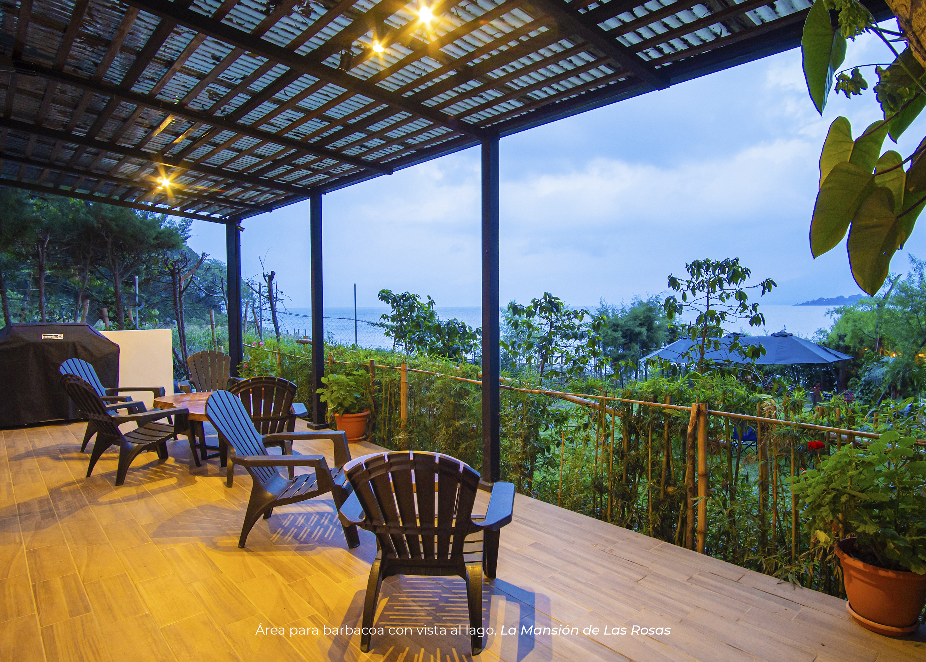 En el primer nivel, cuentas con dos habitaciones. Una de ellas con cama king y baño privado; y la otra habitación con 4 camas imperiales y baño; sala con televisor, comedor, cocina equipada, área para barbacoa y una pérgola con mesas, sillas en el segundo nivel con una vista espectacular al lago, sus volcanes y verdes alrededores.