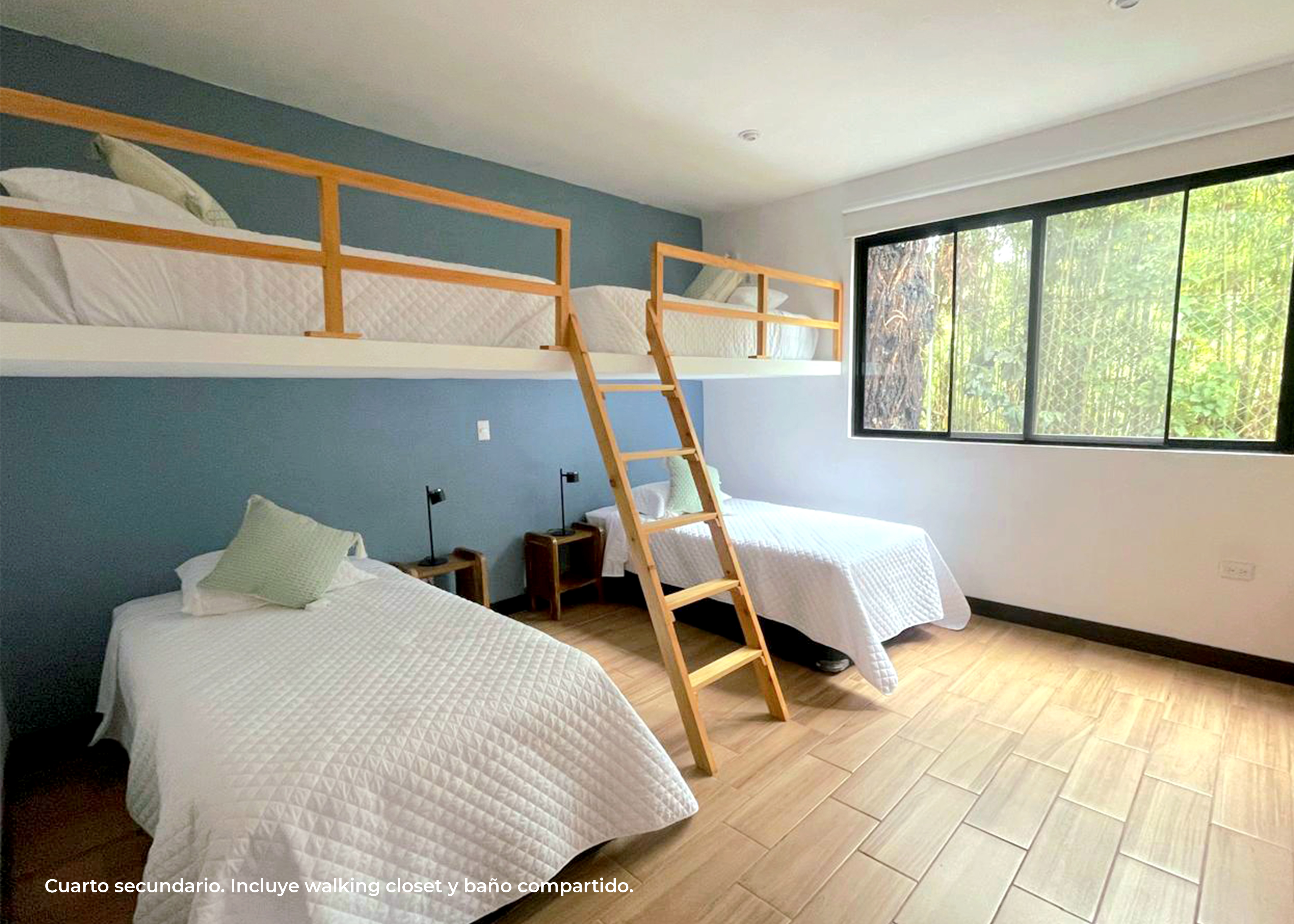 En el primer nivel, cuentas con dos habitaciones. Una de ellas con cama king y baño privado; y la otra habitación con 4 camas imperiales y baño; sala con televisor, comedor, cocina equipada, área para barbacoa y una pérgola con mesas, sillas en el segundo nivel con una vista espectacular al lago, sus volcanes y verdes alrededores.